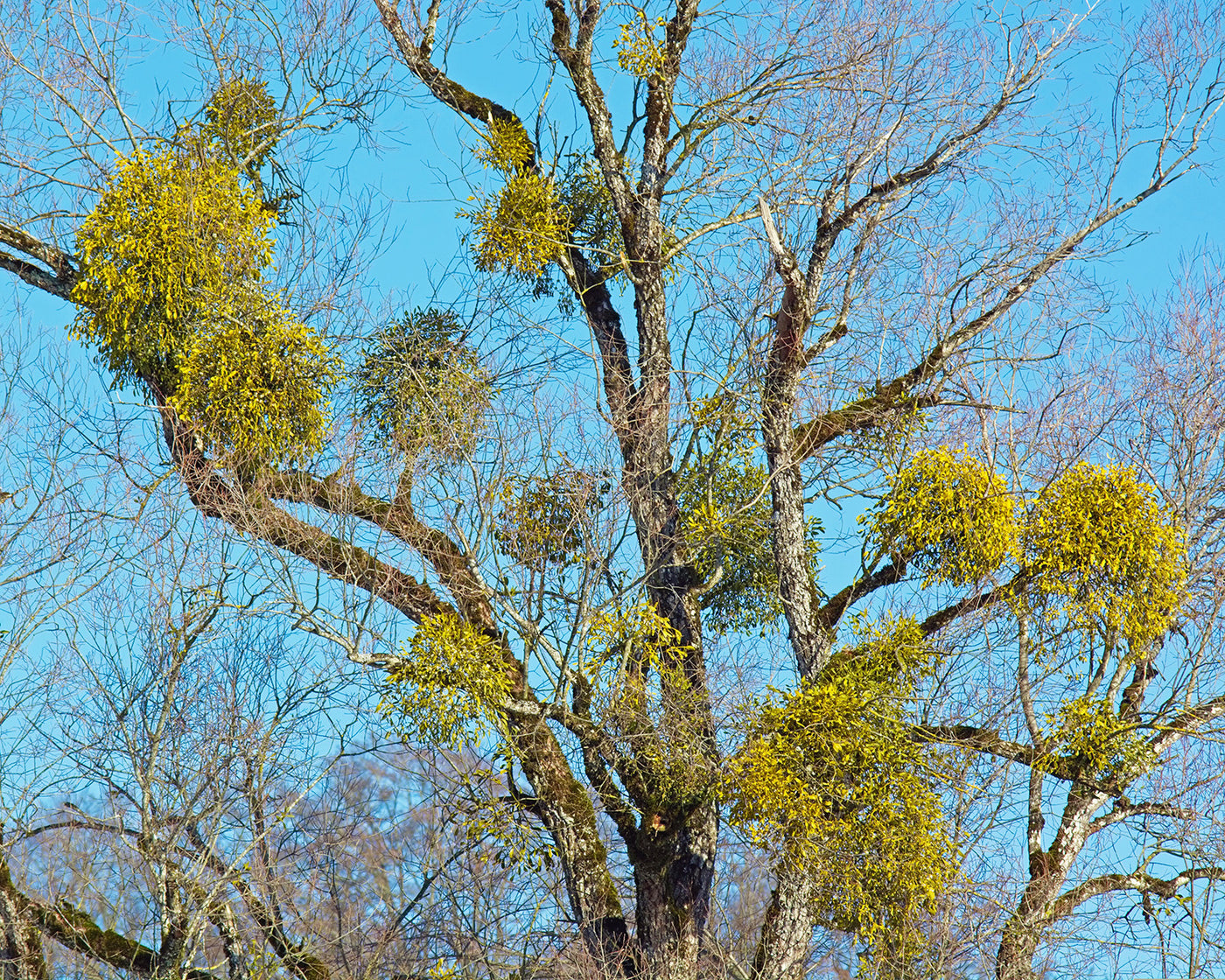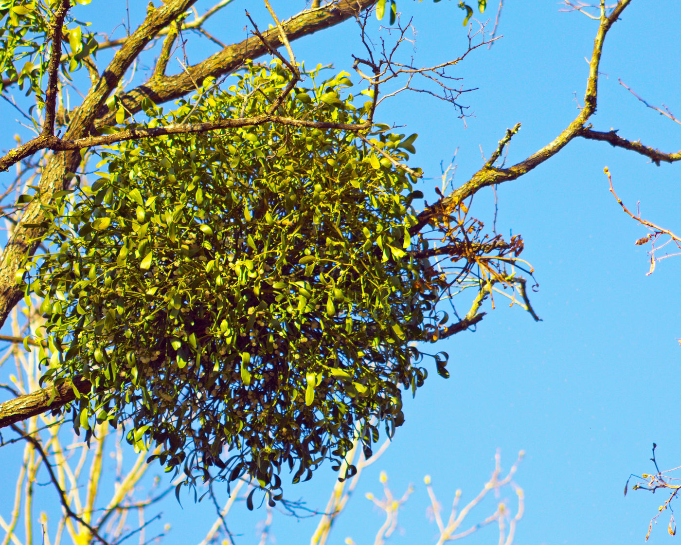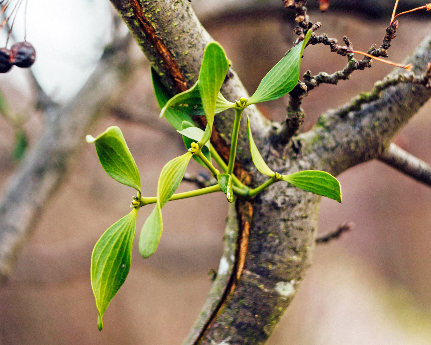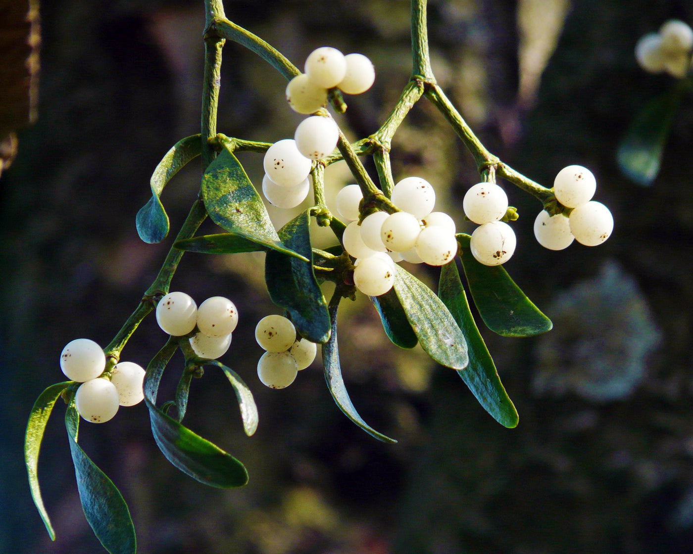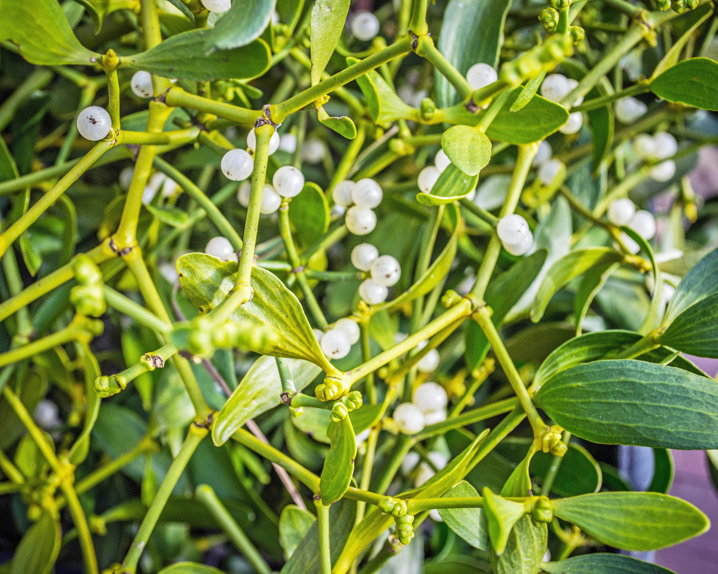 Given its history and evolution, you’re unlikely to find mistletoe in forests or woods, but wander through the countryside, and you’ll find it deep in the boughs of bordering trees. Tiny flowers are a source of nectar for bees and butterflies, with the berries a particular favourite of mistle thrushes and blackcaps, it seems wildlife is immune to the plant’s toxicity, but despite its use for medicinal purposes in different times, consuming the berries can cause blurred vision, diarrhoea, drowsiness and vomiting in humans; in some people, seizures; care should also be taken with pets. Research on its remedial properties continues, however, with cancer treatment at the forefront of possibilities.