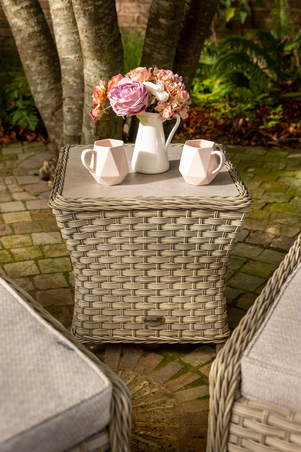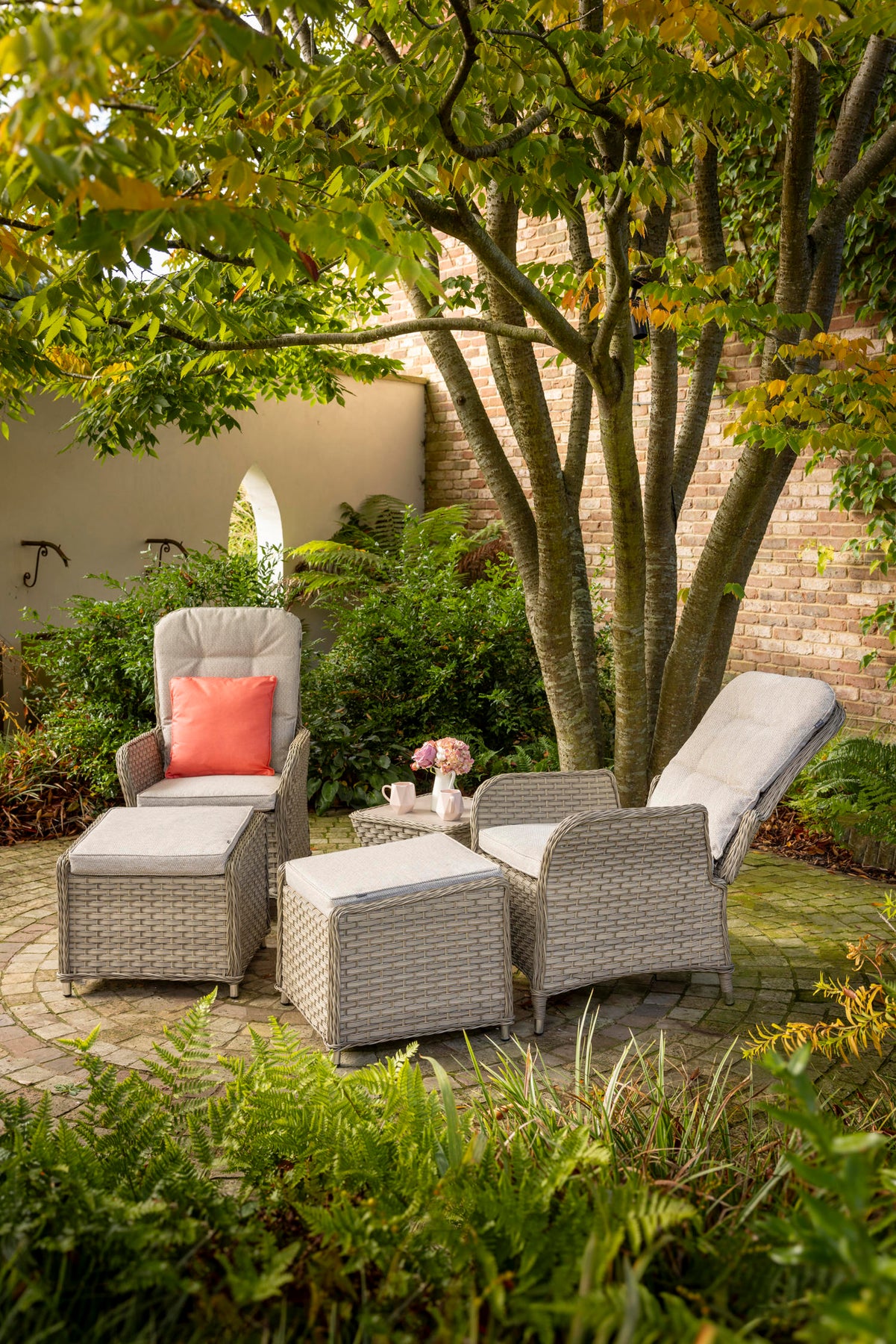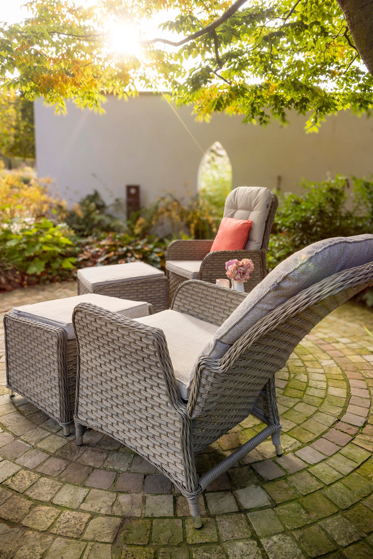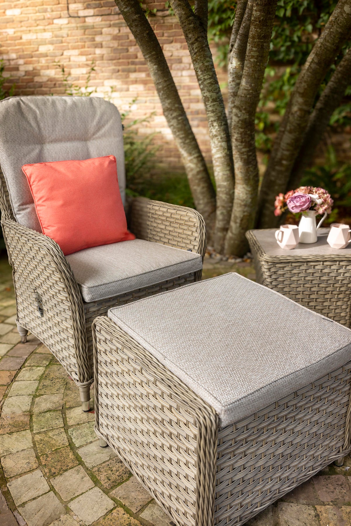 Relax and recline with the Eton reclining companion set, it is the ideal choice for anybody with a small garden space to fill. A compact square side table is perfect for holding drinks while the comfortable reclining chairs give sufficient room to put your feet up and relax under the sun. Resin weave is handwoven onto lightweight but strong aluminium frames which are covered in luxurious permeable Weatherready® cushions, that enable the set to be left outside during summer months. This reclining companion set will bring tranquillity to your outdoor space this summer.